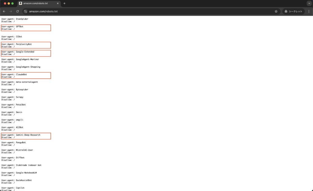こうした背景から、いま注目されているのが robots.txt を使った AI クローラー対策 です。