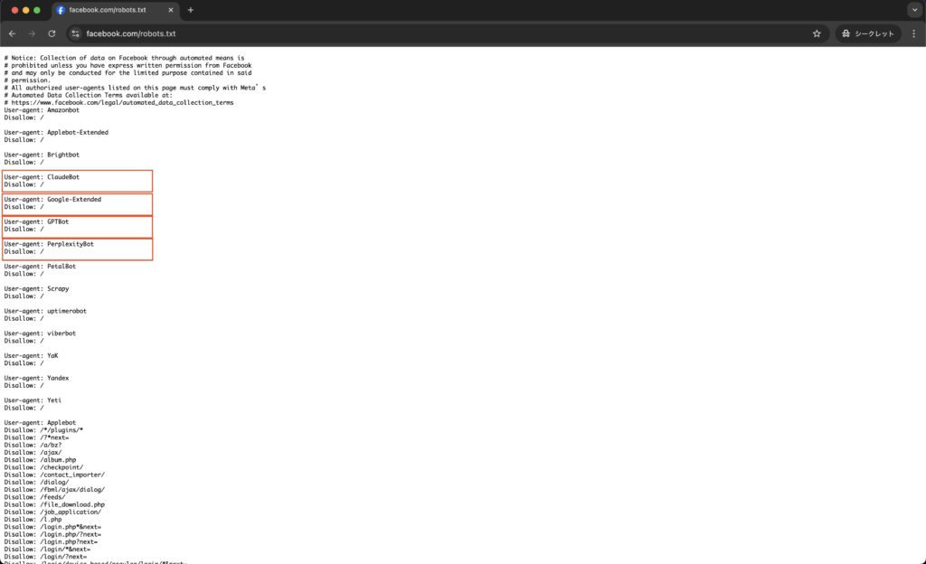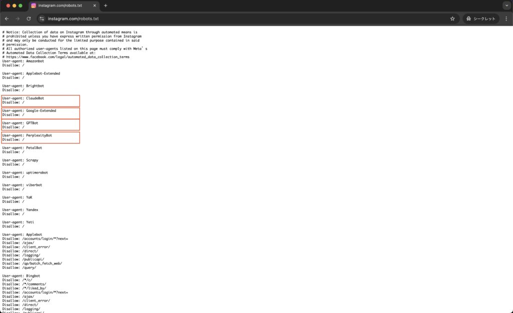 各社のrobots.txtではAIクローラーへの対策をどのように行なっているか実際のrobots.txtを確認してみます。